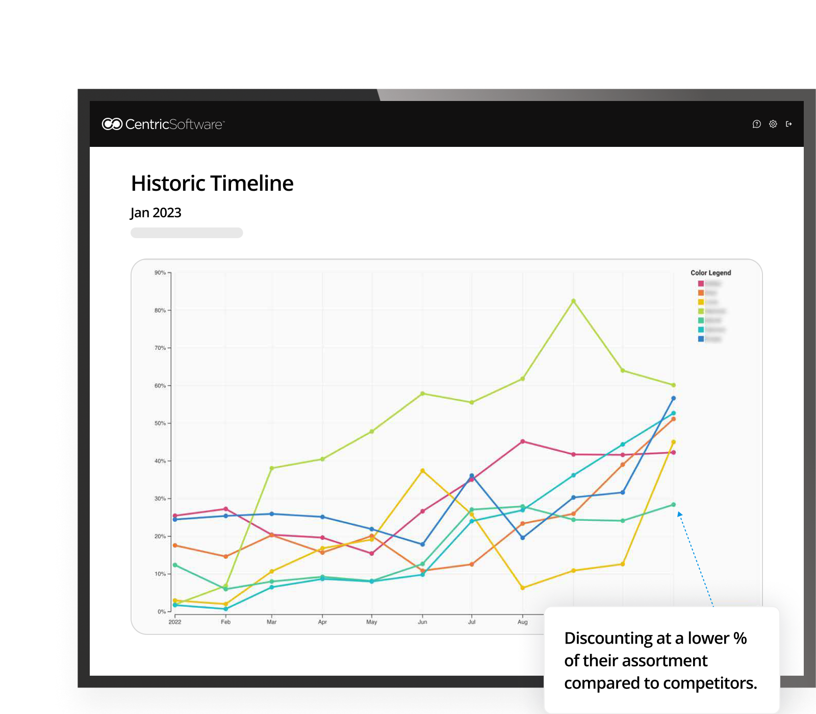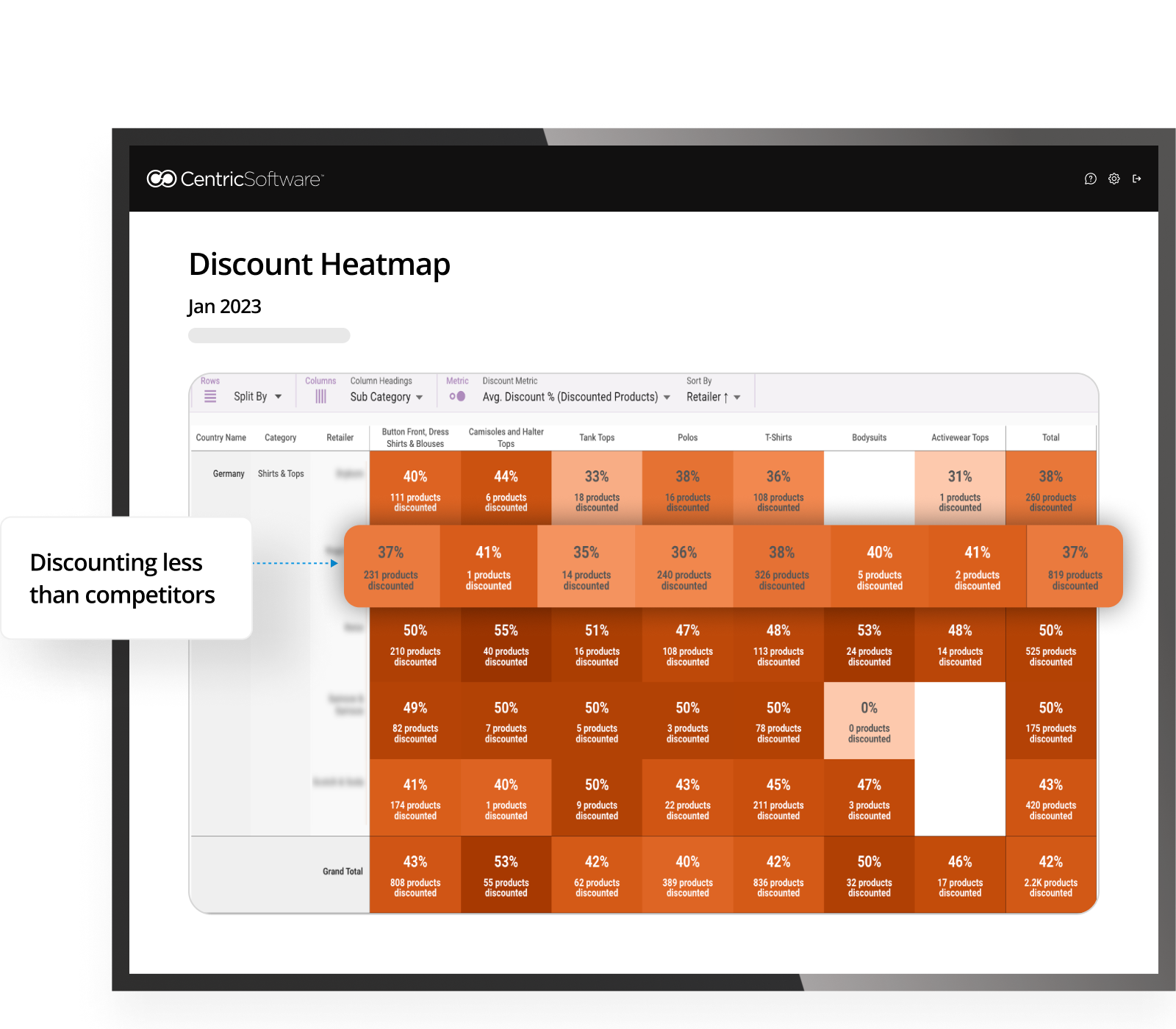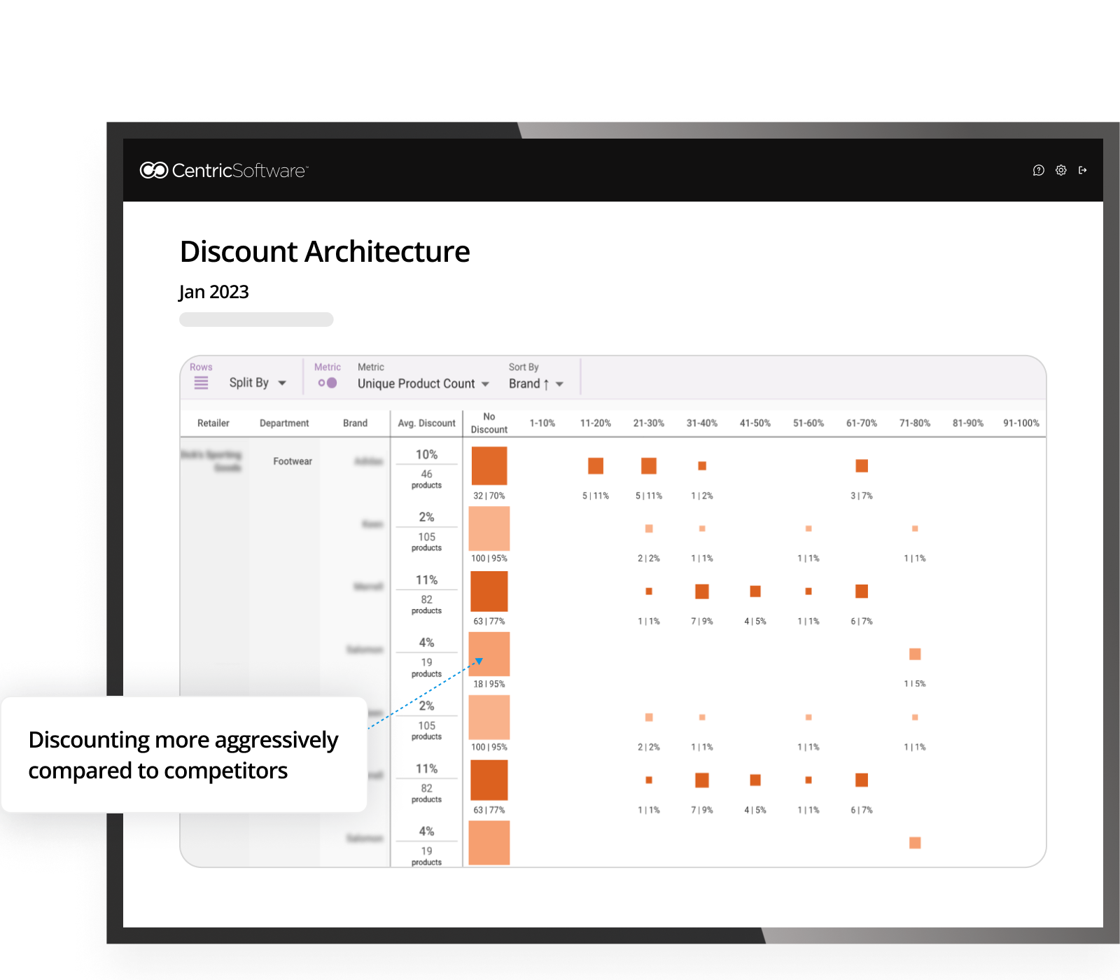 Here, compared to competitors, this company discounts a lower % of their assortment. If a company has a high amount of sale items all concentrated into one category, this indicates an opportunity to discount more parts of their assortment and offer a variety to customers.