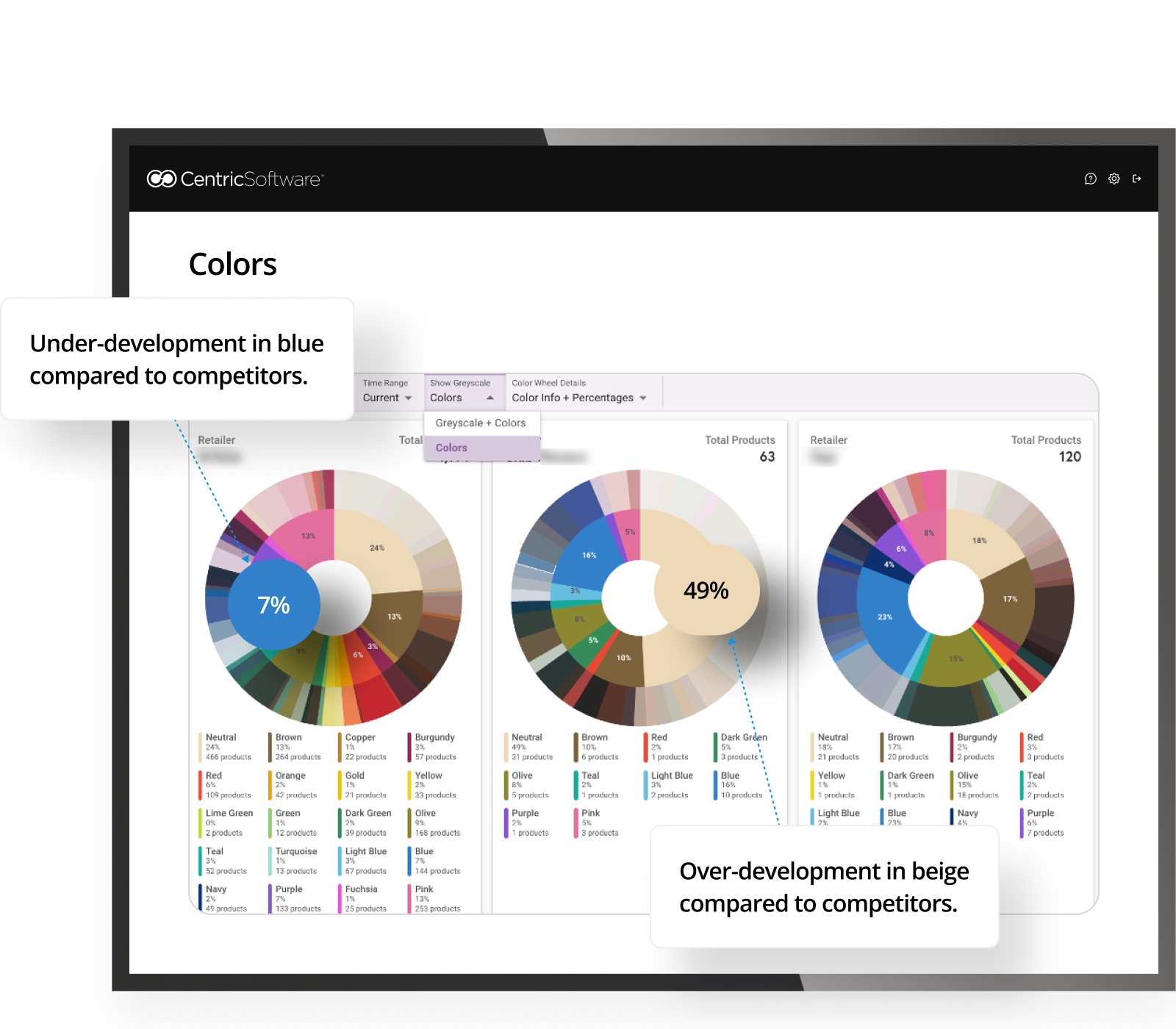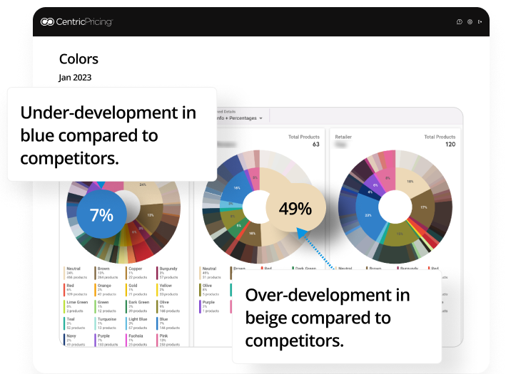 Slice and dice competitor data by color and gain a quick snapshot of the color make up of competitors. This image indicates there may be an under-development in blue but a competitor looks like they’re over-developing in beige.