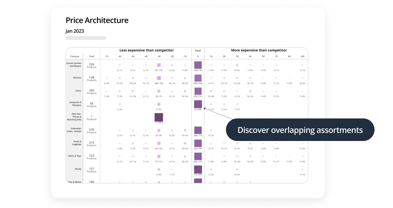 For multi-brand retailers, their assortment is made up of a range of various brands with those same brands sold in another retailer in the same competitive space. With hundreds of exact products being sold in both stores, it becomes an exponentially impossible task to match, compare and track these products without human error or insane amounts of time. But knowing which parts of your assortment are overlapping with your competitors (down to the exact categories, brands and SKUs), at what price they’re selling those items at and when they’re discounting them are crucial questions you must be able to ask and answer to stay competitive.