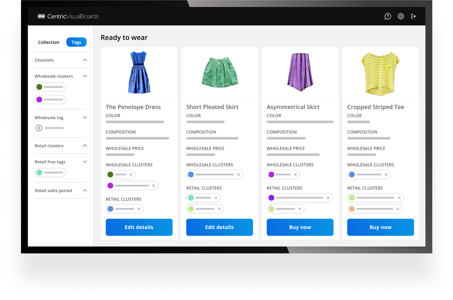 Companies using Centric Visual Boards typically experience benefits such as faster time to market, more profitable assortments and more agile decision-making to react to market shifts, saving time to focus on value-added creative work, reduced paper and printing costs and improved sustainability.