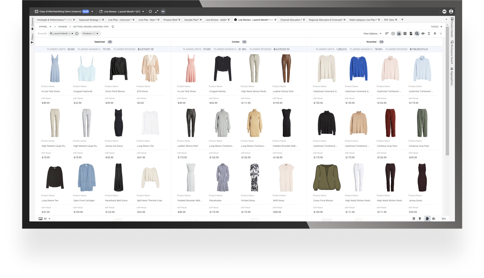 Planning teams precisely forecast and achieve optimal merchandise financial plans using live, visual interactive tools that combine visuals with financials and every point of data from style information to geography, channel and store type.